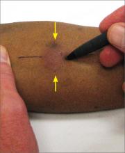 A photo in the article “Tuberculosis testing: Which patients, which test?” (J Fam Pract. 2015;64:553-557,563-565) incorrectly depicted how the induration that arises from a tuberculin skin test should be measured. According to the Centers for Disease Control and Prevention (http://www.cdc.gov/tb/publications/factsheets/testing/skintesting.htm), the induration should be measured across the forearm, perpendicular to the long axis (elbow to wrist), as indicated by the yellow arrows below.