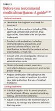 Although medical marijuana is not actually “prescribed,” there are steps to take before recommending or facilitating its use for a particular patient (TABLE 2).25-29