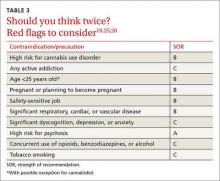 The next step is to determine whether the patient is at low, intermediate, or high risk for use of a controlled substance based on your findings. Patients who are younger than 25 years, for example, have an increased risk.And high-risk patients—those with a history of substance abuse, psychiatric illness, or sexual trauma—are unlikely to be good candidates for medical marijuana10,25,26 and should be informed in a nonjudgmental manner that their problem is better addressed without it.