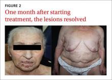 Our patient. We prescribed topical 5% permethrin lotion for our patient to apply to her entire body 4 times a week and advised her to wash her clothing and bed linens at 140° F. She was scheduled for biweekly check-ups. We also advised the patient’s family to use the same topical therapy 2 times per week because crusted scabies is highly contagious. One month later, our patient’s lesions had resolved (FIGURE 2).