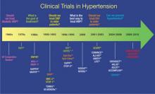 ACCOMPLISH, Avoiding Cardiovascular Events Through Combination Therapy in Patients Living With Systolic Hypertension trial; ALLHAT, Antihypertensive and Lipid-Lowering Treatment to Prevent Heart Attack Trial; ALTITUDE, Aliskiren Trial in Type 2 Diabetes Using Cardiovascular and Renal Disease Endpoints; ANBP1, Australian National Blood Pressure Study 1; ANBP2, Australian National Blood Pressure Study 2; ASCOT, Anglo-Scandinavian Cardiac Outcomes Trial; ATMOSPHERE, Efficacy and Safety of Aliskiren and Aliskiren/Enalapril Combination on Morbi-mortality in Patients With Chronic Heart Failure study; CAPPP, Captopril Prevention Project; CONVINCE, Controlled Onset Verapamil Investigation of Cardiovascular End Points trial; DBP, diastolic blood pressure; EWPHE, European Working Party on High Blood Pressure in the Elderly study; HAPPHY, Heart Attack Primary Prevention in Hypertension trial; HBP, high blood pressure; HDFP, Hypertension Detection and Follow-up Program; HOT, Hypertension Optimal Treatment study; INSIGHT, International Nifedipine GITS Study of Intervention as a Goal in Hypertension Treatment; I-PRESERVE, Irbesartan in Heart Failure with Preserved Systolic Function study; ISH, isolated systolic hypertension; LIFE, Losartan Intervention For Endpoint Reduction in Hypertension trial; MAPHY, Metoprolol Atherosclerosis Prevention in Hypertensives study; MRC-1, Medical Research Council trial of treatment of mild hypertension; MRC-2, Medical Research Council trial of treatment of hypertension in older adults; NORDIL, Nordic Diltiazem study; ONTARGET, Ongoing Telmisartan Alone and in Combination with Ramipril Global Endpoint Trial; SCOPE, Study on Cognition and Prognosis in the Elderly; SHEP, Systolic Hypertension in the Elderly Program; STOP-1, Swedish Trial in Old Patients with Hypertension-1; STOP-2, Swedish Trial in Old Patients with Hypertension-2; Syst-China, Systolic Hypertension in China trial; Syst-Eur, Systolic Hypertension in Europe trial; TOMHS, Treatment of Mild Hypertension Study; TROPHY, Trial of Preventing Hypertension; UKPDS, United Kingdom Prospective Diabetes Study; VA, Veterans Administration; VA MONORx, VA Monotherapy of Hypertension study; VALUE, Valsartan Antihypertensive Long-term Use Evaluation trial.Although the Framingham Study (www.framinghamheartstudy.org) was, of course, one of the seminal studies in the field of CV medicine, it was observational in nature, rather than interventional like most of the studies highlighted in this article.
