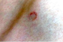 A biopsy of the edge of one of lesions on the torso was performed. Histopathology demonstrated hyperkeratosis of the stratum corneum with focal thickening of the granular cell layer, basal layer degeneration of the epidermis, and a band-like subepidermal lymphocytic infiltrate with Civatte bodies consistent with lichen planus. There was some reduction in the elastic fibers on the papillary dermis.