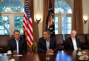 House Speaker John Boehner (left) and Senate Majority Leader Harry Reid (right) met with the President on July 10 to discuss the debt limit. Official White House Photo by Samantha Appleton.