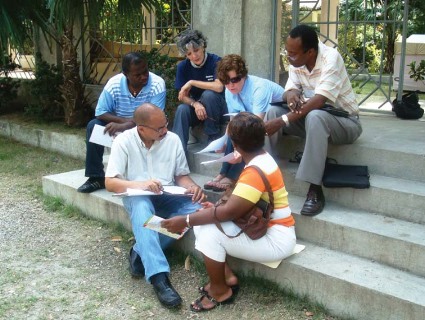 On June 2010, in the backyard of the Jesuit seminary located in the outskirts of Port-au-Prince, Félicité Chatel-Katz, program director of the Rainbow Center for Global Child Health in Cleveland, along with a volunteer health provider met with four members of the executive board of the Haitian Pediatric Society to discuss the feasibility of holding a workshop on psychosocial assistance in Haiti. (See photo.) There was a pressing need to help overcome the traumatic events that affected children so cruelly and was threatening their psychological well-being and development.