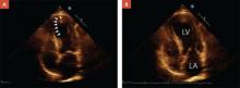 In a patient with reduced ejection fraction, the systolic image (A) reveals septal apical akinesis (arrows) and hypokinesis in the remainder of the left ventricle. The diastolic image (B) is unremarkable.