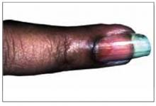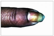 This patient’s fingernail had been discolored for months and the fingertip had recently begun to hurt.