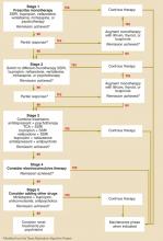 Developed in 1995 from a review of existing antidepressant research and several consensus conferences, the TMAP (continually updated with new research findings) has developed algorithms for treatment of schizophrenia and bipolar disorder in addition to major depression. At each stage in the depression algorithm, treatment plans similar in efficacy and safety are grouped together, and the clinician is given a limited number of options. The later stages in the algorithm are more complex, admittedly with a greater potential for medical complications (Figure).51