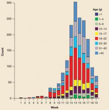 As of May 15, 1765 cases of mumps had been reported to the Iowa Department of Public Health.1 The median age of those infected was 22 years, with more than one third of cases occurring in those aged 16 to 22 years (FIGURE). College students accounted for 20% of cases.