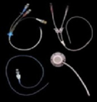 Representative venous access devices. Clockwise from upper left: triple lumen catheter, tunneled catheter, subcutaneous port, PICC.