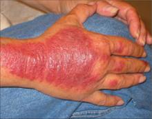 A phototoxic drug reaction is a non-immunologic reaction that manifests 2 to 6 hours after exposure to sunlight.1-3 It can be difficult to differentiate from polymorphous light eruption without a biopsy. A phototoxic drug reaction can be likened to sunburn, with a mild form causing slight erythema and a severe form causing vesicles or bullae.