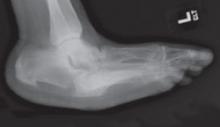 Acute CN is a clinical emergency characterized by pain, warmth, and erythema—making it clinically indistinguishable from cellulitis, osteomyelitis, or gout. Blood tests, including a white blood cell count, sedimentary rate, and uric acid level, may be necessary for diagnosis, as well as radiographs or magnetic resonance imaging. Treatment is long-term (4-6 months) immobilization of the joint to prevent further destruction,10 and bisphosphonates for pain during the acute phase.11 Untreated CN typically results in a rocker-bottom foot deformity (FIGURE) that puts patients at greater risk for plantar ulceration.