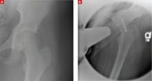 This patient’s radiographic findings (FIGURES 1A and 2A) confirmed that she had experienced sequential bilateral slipped capital femoral epiphysis. SCFE occurs when the femoral head is displaced through the weakened physis, usually medially. Most common in the adolescent years, it is likely caused by the alteration in the plane of the physis during the adolescent growth spurt, in addition to the increased forces of weight gain. Obesity has been shown to be a significant risk factor.1 A small percentage of patients have an underlying endocrine disorder.2,3