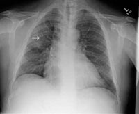 - Chest x-ray film shows right upper lobe infiltrate with minimal pleural effusion (FIGURE 2).