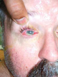 You request an immediate ophthalmology consultation, which confirms that visual acuity in the right eye is limited to light perception. The patient’s left eye exam is normal. In the slit-lamp examination of the right eye, the vitreous view is obscured by hypopyon and corneal haziness. Hypopyon signals inflammation of the anterior uvea and iris. Hypopyon can occur with such noninfectious problems as corneal ulcer, Behçet’s disease, systemic lupus erythematosus, sarcoidosis, and lymphoma/leukemia; and with endophthalmitis or panophthalmitis due to bacterial or fungal infection.