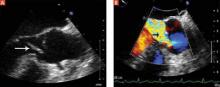 Transesophageal echocardiography image shows a vegetation on the coronary cusp of the aortic valve (A) and significant aortic valve regurgitation (B).