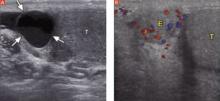 In the image at left, ultrasound reveals an anechoic mass (arrows), representing either an epididymal cyst or spermatocele, superior to the testicle (T). A color Doppler image (right) reveals increased vascularity to the epididymis (E), as compared with the testicle.