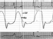 To further evaluate the patient’s cardiac function, a cardiologist performed a right-sided cardiac catheterization. in constrictive pericarditis, equalization of end-diastolic pressures occurs due to limitation of the total volume of the ventricles by a rigid pericardium. in our patient, these pressures did not equalize. his right and left ventricular pressure tracings did, however, have the classic square root sign often seen in constrictive pericarditis (FIGURE 3). This “dip and plateau” is the result of rapid filling of the ventricles during early diastole, with the inflexible pericardium causing an abrupt halt in ventricular filling.1