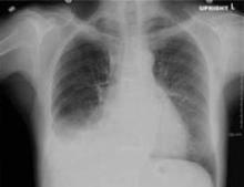 A chest x-ray showed right-sided airspace disease, with an associated small effusion (FIGURE 1), and an electrocardiogram (EKG) revealed a right axis deviation with flipped T waves in V3-V6 (FIGURE 2). A computed tomography (CT) scan of the chest performed 2 months prior to admission revealed a small right pleural effusion, moderate emphysema, and pleural plaques. A transthoracic echocardiogram performed a week earlier was significant for a normal ejection fraction without pericardial thickening, and mild dilation of the left and right atria and the right ventricle.