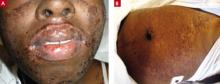 She returned to that ED several times, complaining of headache and fever, then went to a different ED because her lips were swollen and she was developing a rash (FIGURES 1A AND 1B). Initially the rash was red, slightly rough, and covered most of her body (except for her palms and soles). Providers at the second ED discontinued the Bactrim, started her on a course of steroids by mouth, and sent her home.