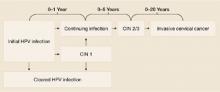 Persistent infection with HPV increases the probability of progression to high-grade cervical intraepithelial neoplasia (CIN) and invasive carcinoma ( FIGURE ).18-19 Evidence also increasingly shows that high-risk HPV types likely cause anal, penile, scrotal, vulvar, vaginal, and some head and neck cancers.25