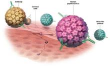 The new HPV vaccines, Gardasil and Cervarix, (see Web table) both contain virosomal antigens to vaccinate against HPV types 16 and 18. Persistent infection with these high-risk HPV types is necessary for the development of cervical cancer. Chronic infection with low-risk HPV types (eg, HPV 6 or 11) may lead to the development of anogenital warts and other low-grade genital abnormalities, as well as laryngeal cancer or recurrent respiratory papillomatosis. Gardasil also contains virosome antigens for these 2 HPV types. Warts on the hands are usually attributable to HPV 7.8