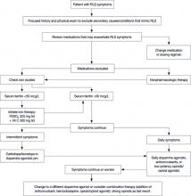 The goal in treating RLS is to decrease the severity and frequency of symptoms, leading to an improvement in sleep quality, a decrease in daytime somnolence, and an overall improvement in quality of life. Treatment guidelines, supported by the IRLSSG and the Medical Advisory Board of the Restless Legs Syndrome Foundation, are based on symptom frequency and severity—whether they are intermittent, daily, or refractory.3,9,17