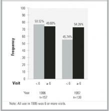 Use status of the groups (somatization, minor acute illness) combined is shown in Figure 2. It shows the (percentage) distribution of use (<6 visits; 6 visits) for 1996 and 1997. Approximately 57% of the somatizers were high users in 1996, compared with 29% of the minor acute illness patients. High use in either 1996 or 1997 was more prevalent among somatizers (70%) than in minor acute illness patients (45%). Persistent high use in both years among minor acute illness patients was 16.7% (95% confidence interval [CI], 8.6%-27.9%) and among somatizers 32.7% (95% CI, 23.8%-42.6%).