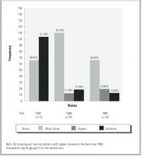 The follow-up status in 1996 and 1997 of the 104 somatizers and the 66 minor acute illness patients initially rated in 1995 appears in Figure 1. It shows the (percentage) distribution of organic diseases, somatization, and minor acute illness diagnoses for 1995, 1996, and 1997, using all available data in each year. Because our rating of patients in 1 of the 3 categories followed a strict protocol (for 13 patients in 1996 and 40 patients in 1997), and because of insufficient information in their charts, we were unable to definitely ascertain their status. None of the patients with minor acute illness were reclassified as somatizers in the follow-up years, and 83% of these patients continued to have minor acute illness in 1996. All but 2 patients had minor acute illness either in 1996 or 1997 or both. Approximately 27% of the somatizers remained somatizers in 1996, 54% were rated as having minor acute illness, and 13% had organic disease. In 27% of these somatizers minor acute illness developed in the 2 subsequent years. Among patients in 1995, the probabilities of somatization for 2 and 3 consecutive years were 3.7% and 1.1%, respectively. In contrast, for minor acute illness these probabilities were 42.5% and 27%, respectively.