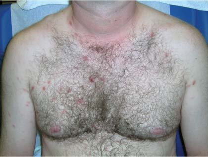 The patient was treated with a single IM injection of benzathine penicillin. Within one week, the eruption was gone and the patient continued with his drug treatment program. At a 6-month follow-up, he was sober and his RPR titer was down 4-fold.