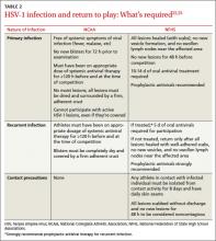 Once diagnosed, management of HSV-1 in athletes is based on whether the infection is primary or recurrent. In both cases, oral antivirals are needed. Acyclovir is the gold standard, but famciclovir and valacyclovir have been proven to be equally effective.39 Both the NCAA and NFHS have published guidelines addressing the question of return to play (TABLE 2).22,23