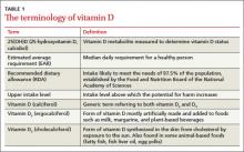 Vitamin D is synthesized in the skin from cholesterol through sun exposure (vitamin D3) and consumed in food fortified with vitamin D2, such as milk, yogurt, and orange juice, or food that contains vitamin D3 (fatty fish and eggs). Both forms of vitamin D are inactive until metabolized in the liver to 25(OH)D (TABLE 1), which is further metabolized in the kidney to the biologically active calcitriol. The 25(OH)D circulates in the blood with a vitamin D–binding protein and is the basis of measurement of serum vitamin D levels.