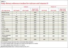 There is universal agreement that vitamin D and calcium are important for bone health. The Institute of Medicine (IOM) recently revised the recommended dietary allowance (RDA) of vitamin D, by age (TABLE 2).2 The IOM calculated the newer RDAs under the assumption that, in the United States and Canada, little or no vitamin D is obtained from sun exposure, particularly given anticancer campaigns that stress sun avoidance. The IOM committee also expressed concern, however, about high levels of vitamin D intake that have not been linked to any proven benefits but have been linked to harms.2 Excess vitamin D from oral intake (not from sun exposure, which is subject to autoregulatory mechanisms) can cause vitamin D intoxication, hypercalcemia, and kidney stones.