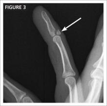 Examination reveals that the injured finger has good capillary refill, 2-point discrimination is intact at 5 mm, and the other fingers on his right hand have no deformities and a normal range of motion. On the injured finger, however, the DIP joint is swollen and tender; it cannot be fully extended (FiGURE 3).