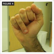 The DIP joint of his right ring finger is swollen (FIGURE 4), but appears normal otherwise. When you isolate the joint, however, the patient is unable to flex it. You can palpate a stump on the volar surface of the finger.