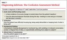 Hypoactive delirium is easily missed. While agitated, or hyperactive, delirium is more easily recognized, it is crucial to be aware of hypoactive delirium, as well. Patients with hypoactive delirium tend to become more withdrawn and their delirium is easily missed, leading to worse outcomes.15 The Confusion Assessment Method (TABLE 1)17 is an easy-to-use validated tool developed to aid in the diagnosis of delirium at the bedside.