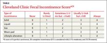 One of the most widely used scales is the Cleveland Clinic Fecal Incontinence Score (TABLE),24 which quantifies both the frequency and type of incontinence and scores the level of severity. Fecal incontinence quality of life scales are available, as well, and include questions about the impact on the patient’s lifestyle, coping behavior, mood, and level of embarrassment.25