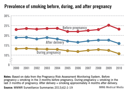 The prevalence of smoking during pregnancy went from 13.2% in 2000 to 10.7% in 2010, and the prevalence of smoking after delivery dropped from 18.9% to 15.9%. In comparison, the prevalence of smoking during the 3 months before pregnancy made a nonsignificant drop from 23% in 2000 to 22.5% in 2007, and rose to 23.2% in 2010, according to data from the Pregnancy Risk Assessment Monitoring System (PRAMS).