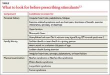 Before prescribing stimulants to children or adolescents with ADHD, complete an in-depth cardiac history and physical examination, as recommended by the AHA and AAP (TABLE),2,3 to identify conditions that increase the likelihood of SCD, such as hypertrophic cardiomyopathy (HCM), long QT interval syndrome (LQTS), and preexcitation syndromes such as Wolff-Parkinson-White syndrome (WPW).