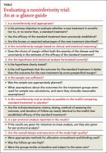 Noninferiority trials have unique design features and methodology and require a different analysis than traditional superiority trials. Yet many physicians know far less about them; many investigators appear to be less than proficient, as well. A review of 116 noninferiority trials and 46 equivalence trials found that only 20% fulfilled generally accepted quality criteria.1 To improve the quality of noninferiority trials, the CONSORT (Consolidated Standards of Reporting Trials) Group has published a checklist for trial design and reporting standards.2,3 Based on this checklist, we came up with 7 key questions to consider when evaluating a noninferiority trial. In the pages that follow, you’ll also find an at-a-glance guide (TABLE) and a methodology review using a hypothetical case (page E7).