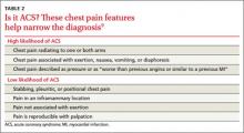 As part of your initial physical examination, assess the patient’s overall condition and stability. Be aware, however, that an older literature review found that a physical exam is only minimally helpful in assessing ACS risk in a patient with chest pain. Findings that may increase the risk of ACS are a third heart sound (positive likelihood ratio [LR+] = 3.2; 95% confidence interval [CI], 1.6-6.5), systolic blood pressure <80 mm/Hg (LR+ = 3.1; 95% CI, 1.8-5.2), and pulmonary crackles on auscultation (LR+ = 2.1; 95% CI, 1.4–3.1); however, the absence of these findings does not exclude ACS.10 The most helpful sign or symptom in evaluating a patient with chest pain is chest wall tenderness on palpation, which largely rules out ACS in low-prevalence settings, such as a primary care office.11