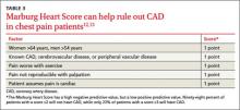 Bösner et al12 developed the Marburg Heart Score (MHS) to help primary care physicians evaluate the risk of CAD in patients with chest pain (TABLE 3).12,13 A subsequent validation study found that an MHS ≥3 had a sensitivity of 89.1% (95% CI, 81.1%-94%) and a specificity of 63.5% (95% CI, 60%-66.9%) for CAD.13 The test’s negative predictive value (NPV) of 97.9% (95% CI, 96.2%-98.9%) means that patients with an MHS ≤2 are very unlikely to have CAD; however, the low positive predictive value (PPV) of only 23.3% (95% CI, 19.2%-28.0%) means an MHS ≥3 is not particularly helpful in diagnosing CAD.12,13