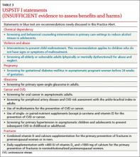Another change from a previous “I” statement pertains to intimate partner violence (IPV). The TF now recommends screening women of childbearing age for IPV and either providing intervention services for those who screen positive for IPV or referring for services. Reproductive age is defined as 14 to 46 years, although the TF admits that most studies have looked at women ≥18 years.11 Most of the benefits from screening and counseling have been demonstrated in pregnant women.
