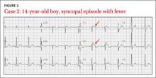 CASE 2 › A 14-year-old boy has a syncopal episode while at rest. A similar event occurred 3 years earlier; at that time, an echocardiogram and EKG were normal. For 2 days, he’s had a cough and low-grade fever. His temperature is 102ºF and he has a productive cough. Based on this EKG (FIGURE 2), what is the likely diagnosis? What is the significance of his fever?