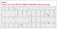 The EKG abnormality and diagnosis. The patient had a classic presentation for Wolff-Parkinson-White (WPW) syndrome, a common congenital disorder that alters normal cardiac conduction. He described 2 past instances of unexplained light-headedness and palpitations. Subsequent EP studies demonstrated that the patient had an accessory atrioventricular (AV) tract, causing electrical activity in the heart to bypass the AV node, resulting in a delta wave on EKG (FIGURE 3, GREEN ARROWS).