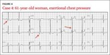 The EKG abnormality and diagnosis. Although classically associated with syncope, hypertrophic cardiomyopathy (HCM) often presents similarly to acute coronary syndromes, with chest pain and dyspnea on exertion.26 This patient had no history of cardiac disease or family history of SCD or cardiomyopathy; however, her EKG showed changes indicating left ventricular hypertrophy (LVH), which is consistent with HCM (FIGURE 4, ARROWS). Echocardiography identified myocardial hypertrophy, normal left ventricular ejection fraction, but severe left ventricular outflow obstruction and mild diastolic dysfunction. She was treated with metoprolol and verapamil.