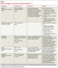 The Veterans Affairs Diabetes Trial (VADT) randomized patients with poorly controlled type 2 diabetes to intensive or standard therapy.9 At 6 months, the intensive therapy group’s HbA1c averaged 6.9%, compared with 8.4% for the standard therapy group. Except for a delay in the progression of albuminuria, no significant effects of intensive therapy were found: Rates of other microvascular complications, major cardiovascular events, and death were similar.9 It should be noted that the VADT involved fewer participants and shorter follow-up than the other trials cited (TABLE 1),3-10 which may have affected its findings.