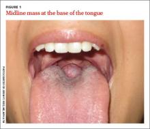 On examination, we noted a purplish, 3 × 3 cm, midline posterior tongue mass with marked superficial vasculature (FIGURE 1). The mass was firm, nontender, and non-friable on palpation. Nasopharyngoscopy revealed a patent airway. There were no other lesions.