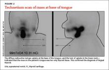 Lingual thyroid results when the thyroid fails to descend from the base of the tongue into the lower neck during early embryongenesis. Based on the clinical presentation and location of the mass, and the fact that it had grown larger during pregnancy, we suspected she had lingual thyroid. This is a rare condition that results from the failure of the thyroid to descend from the base of the tongue into the lower neck during early embryogenesis.1 We ordered thyroid function tests and a technetium scan (FIGURE 2), which showed diffuse radioactive isotope uptake at the base of the tongue and no uptake in the lower neck. This indicated that the mass on the tongue was the patient’s only thyroid tissue and thus confirmed the diagnosis.