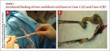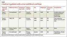 Outcomes for our patients and their infants. All 4 cases had good outcomes (TABLE). The umbilical cord knot produced no detectable fetal compromise in cases 1 through 3. In Case 4, electronic fetal monitoring showed repeated variable fetal heart rate decelerations, presumably associated with cord compression.