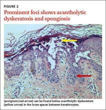 A diagnosis of Grover’s disease is usually made clinically based on the appearance of the rash and the patient’s age and sex (typically seen in middle-aged men). The diagnosis can be confirmed by biopsy. Under a microscope, Grover’s disease has a characteristic appearance of acantholytic dyskeratosis (FIGURE 2); it can be similar in appearance to Darier’s disease, Hailey-Hailey disease, or pemphigus.7